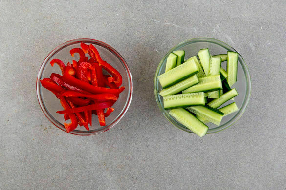 Die Gurken in ca. 1cm dünne und 5cm lange Stifte schneiden. Die Paprika vierteln, entkernen und in dünne Streifen schneiden.