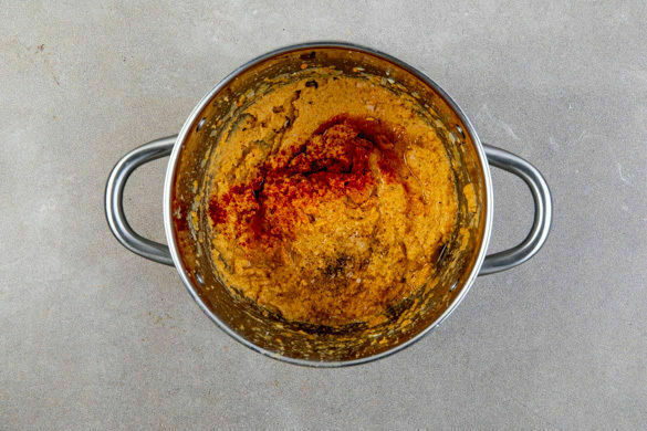 Die Zwiebeln und den Knoblauch schälen und fein würfeln. Die Zwiebeln in einer großen Pfanne mit 2EL Olivenöl bei mittlerer Hitze 5–7Min. goldbraun anbraten. Zum Ende der Garzeit den Knoblauch, die Gewürzmichung und die ½ des Paprikapulvers hinzugeben und ca. 1Min. mitbraten. Die Zwiebeln aus der Pfanne nehmen und beiseitestellen. Die Pfanne auswischen.