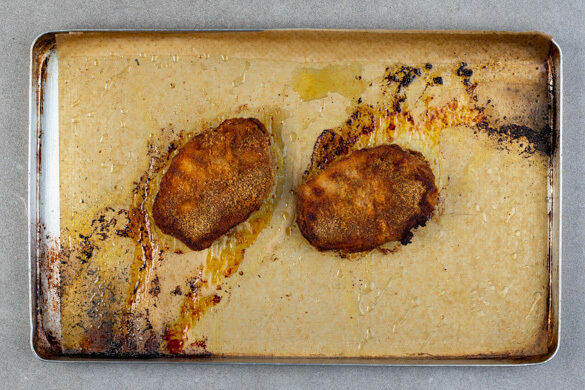 Das Backblech aus dem Ofen nehmen und das Fleisch auf das heiße Öl legen. Vorsicht, das Backblech ist heiß. Die Schnitzel mit 2TL Olivenöl beträufeln und im Ofen 10–15Min. backen, dann wenden und in weiteren 10–15Min. goldbraun und knusprig backen.