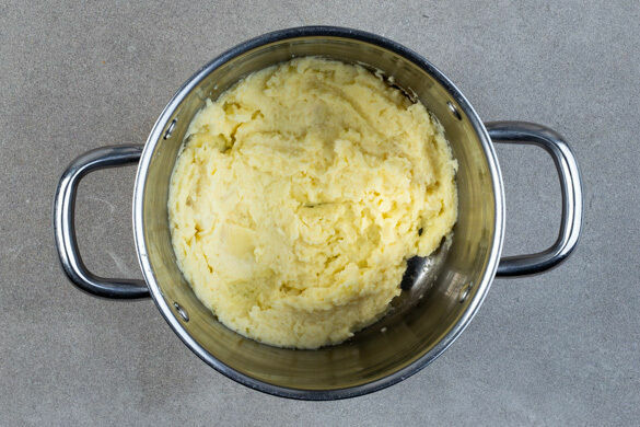 Den Sellerie mit einem Messer schälen und in 3–4cm große Stücke schneiden. In einem kleinen Topf mit kaltem Wasser bei starker Hitze zum Kochen bringen. Dann die Hitze reduzieren und den Sellerie in 10–12Min. weich köcheln. Den Sellerie in ein Sieb abgießen, mit ½EL Butter zurück in den Topf geben und mit einem Stabmixer cremig pürieren. Mit Salz und Pfeffer abschmecken.