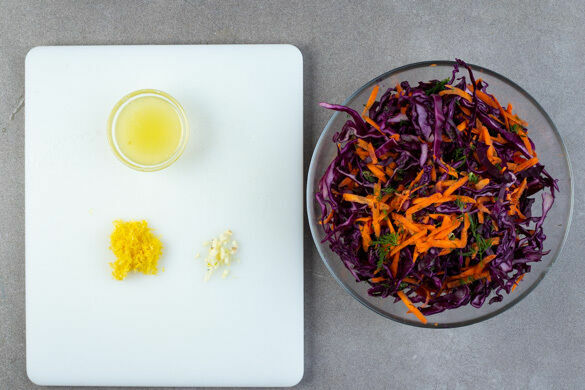 Die Karotte ggf. schälen und grob reiben. Die ½ des Rotkohls in dünne Streifen schneiden. Die Dillspitzen und -stängel separat grob schneiden. Die Karotten, den Rotkohl und die Dillspitzen in eine große Schüssel geben. Den Knoblauch schälen und grob würfeln. Die Zitronenschale abreiben, dann die Zitrone halbieren und eine Hälfte auspressen.