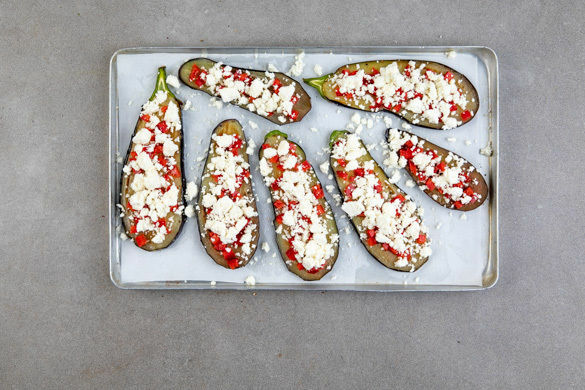 Den Feta mit den Fingern oder einer Gabel zerkrümeln. Die Auberginenscheiben auf ein mit Backpapier ausgelegtes Backblech geben und die 1/2 der Paprikawürfel sowie den Feta auf den Auberginenscheiben verteilen.