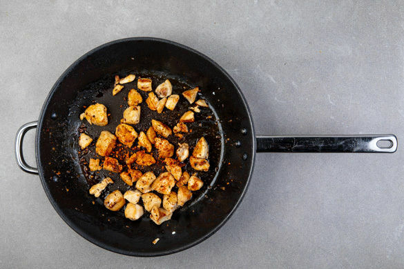 Das Fleisch trocken tupfen, in mundgerechte Stücke schneiden und mit der ½ der Gewürzmischung in einer mittelgroßen Pfanne mit 2TL Olivenöl bei mittlerer Hitze 5–6Min. rundum goldbraun anbraten. Mit Salz und Pfeffer würzen, aus der Pfanne nehmen und auf einem Teller beiseitestellen.
