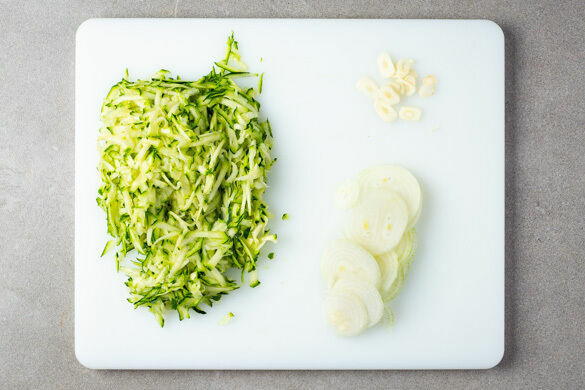 In einem mittelgroßen Topf ausreichend gesalzenes Wasser für die Gnocchi zum Kochen bringen. Die Zucchini grob raspeln. Die Zwiebel schälen und in dünne Ringe schneiden. Den Knoblauch schälen und in dünne Scheibchen schneiden.