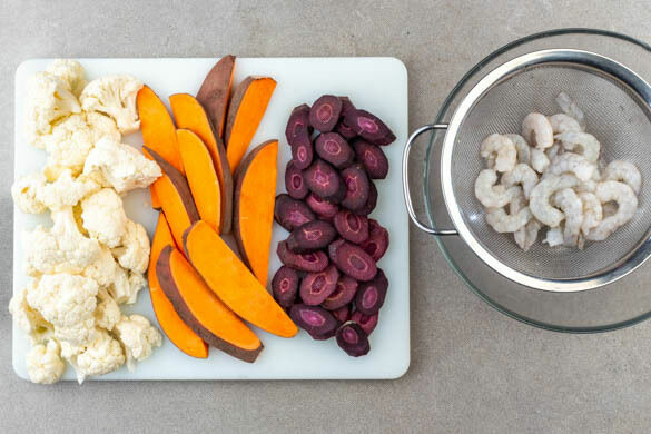 Den Backofen auf 240°C (220°C Umluft) vorheizen. Den Blumenkohl in mundgerechte Röschen zerkleinern. Die Süßkartoffel ggf. schälen und in ca. 1cm breite Spalten schneiden. Die Karotten ggf. schälen und schräg in dünne Scheiben schneiden. Die Garnelen in einem Sieb kalt abspülen und abtropfen lassen, dann trocken tupfen.