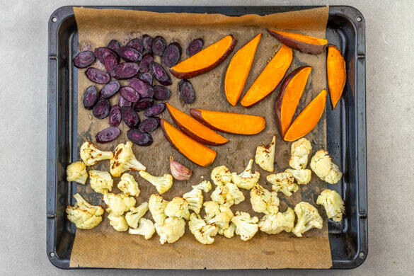 Den Blumenkohl, die Süßkartoffeln, die Karotten und den Knoblauch samt Schale auf einem mit Backpapier ausgelegten Backblech mit 2EL Olivenöl und 1 kräftigen Prise Salz vermengen und im Ofen ca. 10Min. vorbacken.