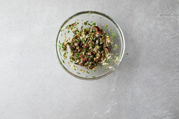Die Schalotte schälen und fein würfeln. Die Petersilienblätter abzupfen und fein hacken. Die Oliven grob hacken und mit den Schalotten, der Petersilie, dem restlichen Senf, 1TL Zitronensaft, 1–2TL Olivenöl und 2–3TL Wasser vermengen.