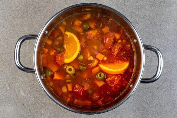 Die Oliven und die übrige Orangenspalte halbieren, in das Ragout geben und mitköcheln. Das Ragout mit mehr mehr Harissapaste nach Geschmack nachwürzen.