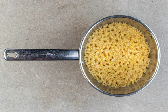 Inzwischen in einem kleinen Topf 300ml leicht gesalzenes Wasser zum Kochen bringen. Den Bulgur in das kochende Wasser rühren und abgedeckt bei niedriger Hitze 8–10Min. sanft köcheln lassen, bis das Wasser aufgesaugt und der Bulgur gar ist. Noch ca. 5Min. ohne Hitzezufuhr ziehen lassen.