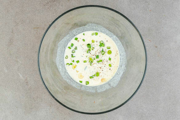 Die Zitronenschale abreiben, dann die Zitrone halbieren und auspressen. Die Lauchzwiebel in feine Ringe schneiden. Die Crème fraîche mit 2EL Zitronensaft, 2TL Senf sowie ½TL Salz und Pfeffer zu einem Dressing verrühren und die Lauchzwiebeln untermengen.