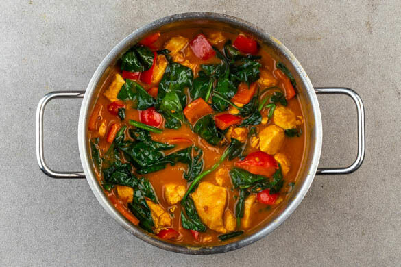 Die Paprika mit 1EL Pflanzenöl in den Topf geben und 1–2Min mitbraten. Dann die Currysauce unterrühren und das Curry ca. 5Min. sanft köcheln lassen. Ggf. mehr Wasser hinzufügen. Anschließend den Spinat portionsweise unterheben und zusammenfallen lassen und das Curry mit Salz und Pfeffer abschmecken.