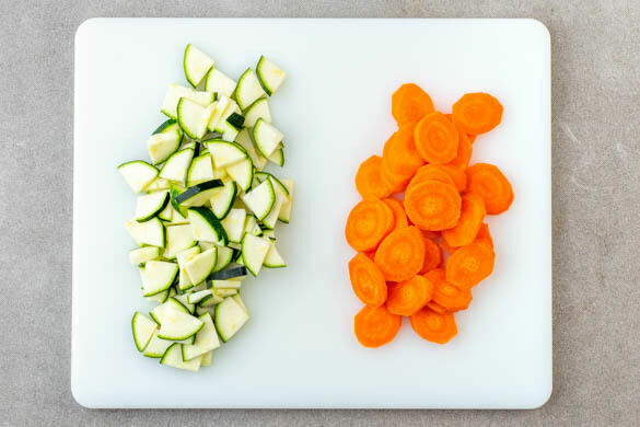 Die Karotten ggf. schälen und schräg in ca. 0,5cm breite Scheiben schneiden. Die Zucchini längs vierteln und quer in ca. 0,5cm breite Stücke schneiden.