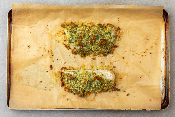 Den Fisch kalt abspülen, trocken tupfen und evtl. vorhandene Gräten mit einer Pinzette entfernen. Von beiden Seiten mit je 1 kräftigen Prise Salz und Pfeffer würzen. Dann auf ein mit Backpapier ausgelegtes Backblech legen und gleichmäßig mit dem Topping bedecken. Im Ofen in 15–20Min. goldbraun und knusprig backen.
