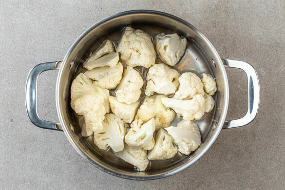 In einem mittelgroßen Topf 300ml leicht gesalzenes Wasser zum Kochen bringen. Den Blumenkohl in kleinere Röschen zerteilen und direkt in den Topf geben. Sobald das Wasser kocht, die Hitze reduzieren und unter gelegentlichem Rühren 10–12Min. köcheln lassen, bis der Blumenkohl sehr weich ist. Vom Herd nehmen und abgedeckt beiseitestellen.