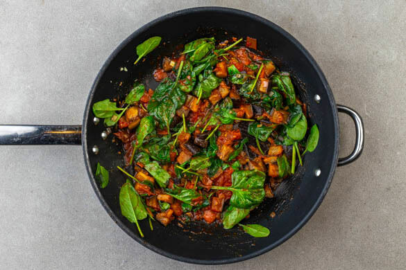 Den Knoblauch schälen, fein reiben und mit der ½ des 5-Gewürze-Pulvers in der Pfanne mit ½TL Olivenöl bei mittlerer Hitze ca. 30Sek. anbraten. Erst die Sojasauce, die ½ der Chilipaste und ½EL braunen Zucker, dann 2EL Wasser einrühren, bis sich die Chilipaste aufgelöst hat. Die Auberginenmischung zugeben und den Spinat portionsweise unterheben und zusammenfallen lassen.