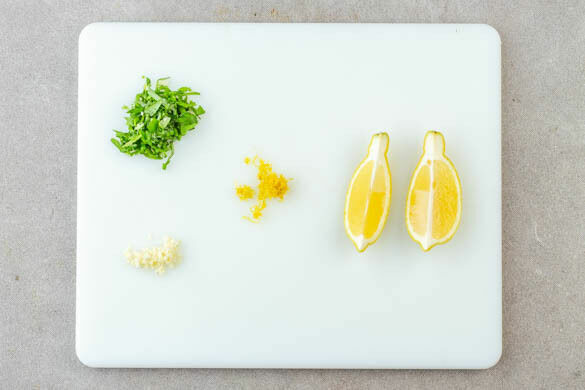 Den Knoblauch schälen und fein würfeln. Die Zitronenschale abreiben, dann die Zitrone in 4 Spalten schneiden. Das Basilikum fein schneiden.