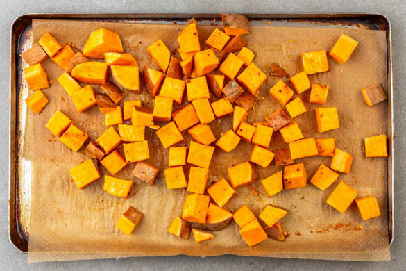 Den Backofen auf 220°C (200°C Umluft) vorheizen. Die Süßkartoffeln samt Schale in ca. 2cm große Würfel schneiden, auf einem mit Backpapier ausgelegten Backblech mit 1EL Olivenöl und der ½ der Gewürzmischung vermengen und 15Min. im Ofen backen.