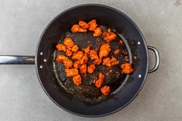 Die vegane Chorizo in mundgerechte Stücke zerbröckeln und in einer mittelgroßen Pfanne mit 1EL Olivenöl bei mittlerer Hitze unter gelegentlichem Wenden in 3–5Min. rundum goldbraun braten.
