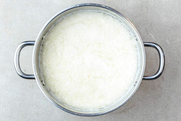 Den Backofen auf 240°C (220°C Umluft) vorheizen. In einem mittelgroßen Topf ausreichend gesalzenes Wasser zum Kochen bringen. Den Blumenkohlreis in das kochende Wasser geben und ca. 5Min. kochen. Den Hartkäse reiben. Den Blumenkohl in ein feines Sieb abgießen und kalt abschrecken, dann über einer Schüssel in ein sauberes Küchentuch geben und die überschüssige Flüssigkeit auspressen.