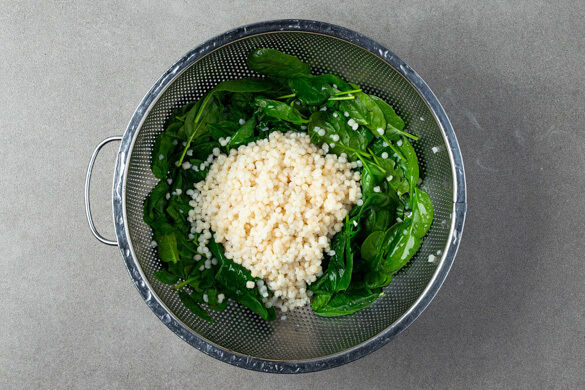 Den Spinat in ein Sieb geben und den Perlencouscous in das Sieb abgießen, sodass der Spinat durch das heiße Wasser zusammenfällt. Den Spinat und den Perlencouscous in eine Schüssel oder zurück in den Topf geben und 1EL Olivenöl unterrühren.