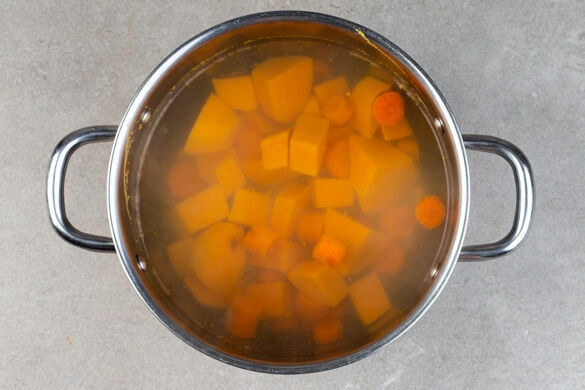 Die Süßkartoffelwürfel und die Karottenscheiben in das kochende Wasser geben und in 10–12Min. gar kochen.