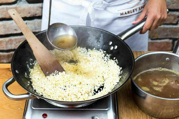 Den Reis in die Pfanne geben und 1–2Min. anrösten. Nach und nach etwas Brühe unter Rühren zum Reis hinzufügen und köcheln lassen, bis der Reis die Brühe aufgesogen hat. Diesen Vorgang 18–20Min. lang wiederholen, bis die Brühe fast aufgebraucht, aber der Reis noch nicht ganz gar ist.