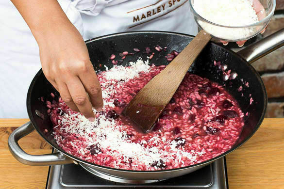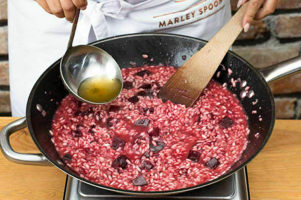 Die Rote Bete dazugeben und alles gut verrühren. Dann die restliche Brühe dazugeben und den Reis in 3–5Min. fertig garen.