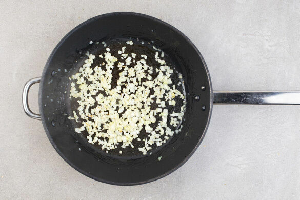 Die Zwiebeln in einer großen Pfanne mit 1EL Pflanzenöl und 1 Prise Salz bei starker Hitze 1–2Min. glasig anbraten.