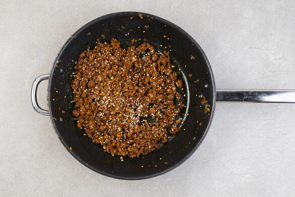Das Hackleisch in die Pfanne geben und 5–6Min. kräftig anbraten, dabei stetig rühren, damit das Hackfleisch schön krümelig wird. Mit Salz und Pfeffer abschmecken und die ½ des Sesams unterrühren.