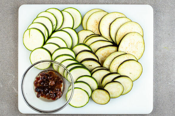 Den Backofen auf 240°C (220ºC Umluft) vorheizen. Die Rosinen mit warmem Wasser übergießen und einweichen lassen. Die Aubergine und die Zucchini quer in ca. 0,5cm dicke Scheiben schneiden.