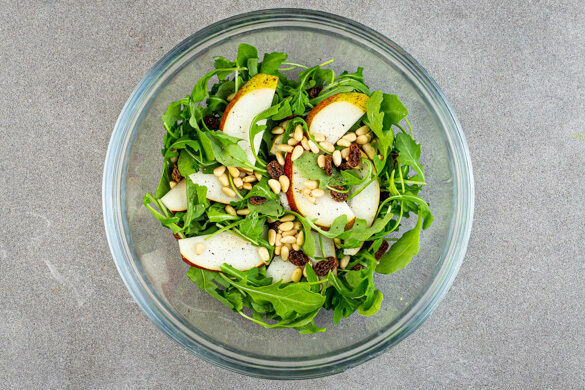 Die Birne längs halbieren und eine Hälfte in ca. 0,5cm dicke Scheiben schneiden, dabei das Kerngehäuse entfernen. Den Rucola in eine große Schüssel geben, dann je 1 Prise Salz und Pfeffer ca. 30Sek. einmassieren. Die Rosinen in ein Sieb abgießen und mit der ½ der Pinienkerne oder mehr und den Birnen unter den Salat heben.