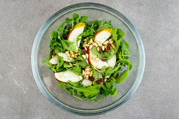 Die Birne längs halbieren und in ca. 0,5cm dicke Scheiben schneiden, dabei das Kerngehäuse entfernen. Den Rucola in eine große Schüssel geben, dann je 1 kräftige Prise Salz und Pfeffer ca. 30Sek. einmassieren. Die Rosinen in ein Sieb abgießen und mit den Pinienkernen und den Birnen unter den Salat heben.