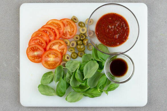 Die Tomaten in dünne Scheiben schneiden. Die Oliven in dünne Ringe schneiden. Die Basilikumblätter von den Stängeln zupfen. Die Harissapaste mit 2EL Wasser verrühren. 2EL Olivenöl mit 2EL Balsamicoessig sowie je 1 Prise Salz und Pfeffer zu einem Dressing verrühren.
