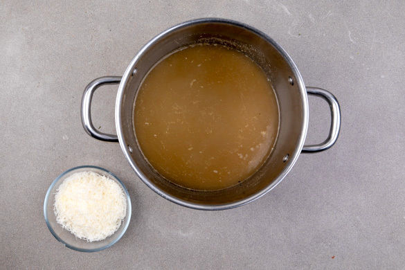 1L Wasser mit dem Brühwürfel in einem mittelgroßen Topf aufkochen lassen und die Brühe mit Salz und Pfeffer abschmecken. Den Käse fein reiben.