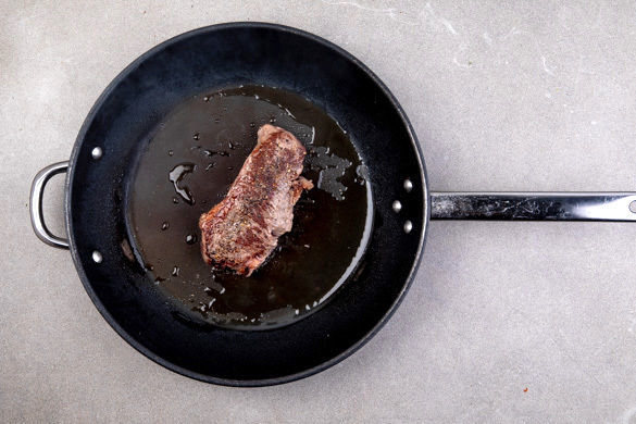 Das Fleisch mit etwas Küchenkrepp trocken tupfen, mit Salz und Pfeffer würzen und in einer mittelgroßen, ofenfesten Pfanne mit 1–2EL Olivenöl bei starker Hitze auf jeder Seite ca. 1Min. scharf anbraten, dann 6–7Min. im Ofen zu Ende garen. Aus dem Ofen nehmen und 2–3Min. auf einem Teller ruhen lassen. Tipp: Wer keine ofenfeste Pfanne hat, kann das Fleisch auch in eine Auflaufform geben.