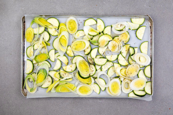 Die Zucchini und den Lauch auf ein mit Backpapier ausgelegtes Backblech geben und mit 1–2EL Olivenöl beträufeln. Mit Salz und Pfeffer würzen und 15–18Min. im Ofen rösten.