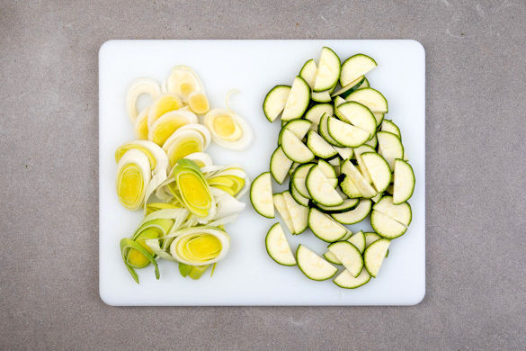 Den Backofen auf 200°C Umluft (220°C Ober–/Unterhitze) vorheizen. Die Zucchini längs halbieren und in ca. 0,5cm dünne Scheiben schneiden. Den Lauch schräg in ca. 0,5cm dünne Ringe schneiden.