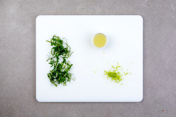 Die Limettenschale abreiben, dann die Limetten halbieren und auspressen. Die Basilikumblätter von den Stängeln zupfen, ineinander einrollen und in feine Streifen schneiden.