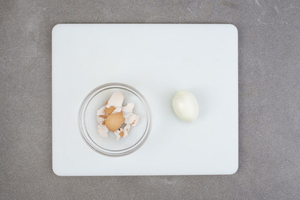 In einem kleinen Topf ausreichend Wasser zum Eierkochen zum Kochen bringen. Sobald das Wasser kocht, 1 Ei hineingeben und in 8Min. hart kochen. Das zweite Ei nicht mitkochen, es wird später noch benötigt. Das gekochte Ei mit kaltem Wasser abschrecken, kurz abkühlen lassen und schälen.