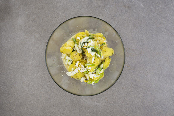 Die Kartoffeln in ca. 0,5cm große Scheiben schneiden. Die Salatsauce vorsichtig mit den Kartoffeln vermengen. Ggf. noch etwas Wasser hinzugeben und nach Wunsch erneut mit Salz, Pfeffer und Essig abschmecken.