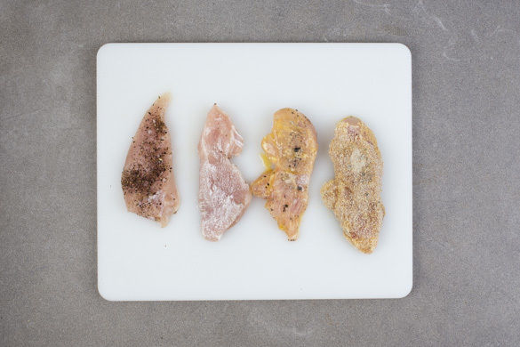 Die Hähnchenbrust schräg in ca. 4 dünne Schnitzel schneiden und mit Salz und Pfeffer würzen. Das restliche Ei mit einer Gabel verquirlen. Die Schnitzel nacheinander in etwas Mehl wenden, durch das verquirlte Ei ziehen und in den Semmelbröseln wenden, bis sie gut bedeckt sind. Die Panade leicht andrücken.