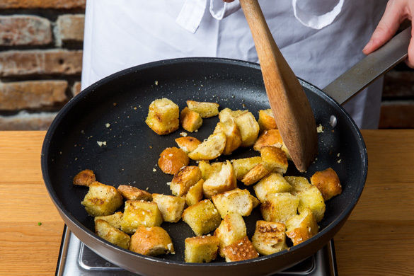 Ca. die 1/2 des Knoblauchs mit 1–2EL Olivenöl in einer mittelgroßen Pfanne erhitzen und die Brotwürfel darin anrösten. Die Croûtons mit 1 Prise Salz würzen, aus der Pfanne nehmen und beiseitestellen. Die Pfanne aufbewahren.