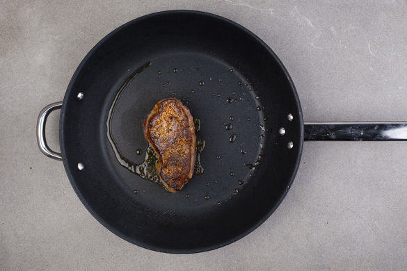 Das Fleisch trocken tupfen und mit etwas von der übrigen Gewürzmischung sowie Salz und Pfeffer einreiben. In einer mittelgroßen Pfanne bei starker Hitze auf jeder Seite ca. 1Min. scharf anbraten, dann das Fleisch zu den Zucchini geben und 5–7Min. im Ofen mitrösten. Nach dem Backen ca. 2Min. auf einem Teller ruhen lassen.