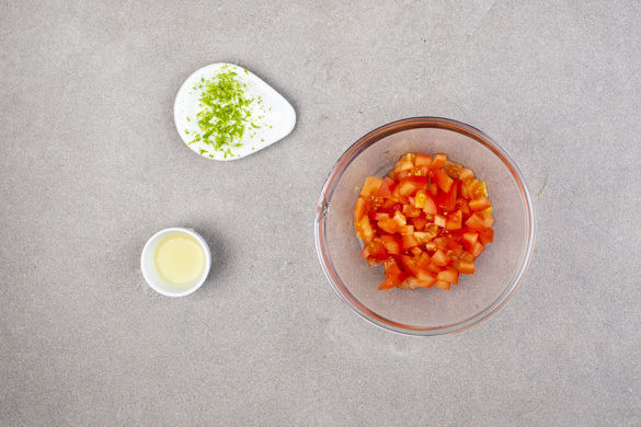 Die Limettenschale abreiben, dann die Limette halbieren und auspressen. Die Tomaten in kleine Würfel schneiden, dabei den Strunk entfernen.