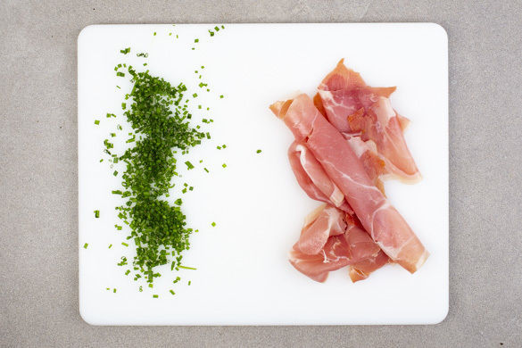 Den Schnittlauch in feine Röllchen schneiden und mit etwas Butter unter die Kartoffeln mengen. Die Kartoffeln nach Geschmack salzen. Die 1/2 der Schinkenscheiben einzeln aufrollen und mit dem Spargel und den Kartoffeln anrichten. Mit den buttrigen Semmelbröseln garnieren und servieren. Tipp: Wer mag, kann auch mehr Schinken verwenden.