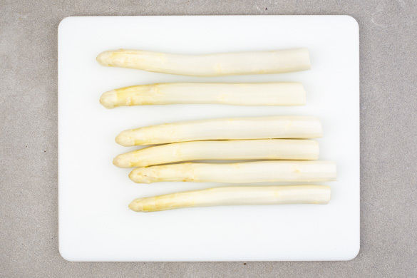 Den Spargel ca. 2cm vom Kopf an abwärts schälen und die holzigen Enden abschneiden.