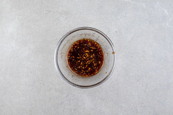 Den Knoblauch schälen und fein hacken Die 1/2 des Knoblauchs mit der 1/2 der Fischsauce, der 1/2 der Sojasauce und der Tamarindenpaste zu einer Würzsauce verrühren.