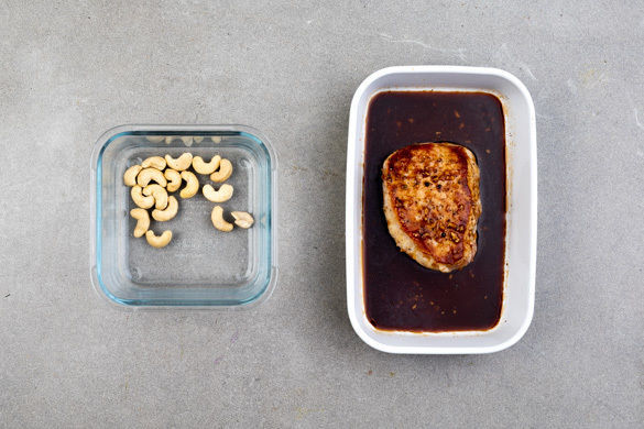 Das Fleisch mit etwas Küchenkrepp trocken tupfen und in einer mittelgroßen Pfanne mit 1–2EL Pflanzenöl bei starker Hitze auf jeder Seite ca. 1Min. scharf anbraten. In eine Auflaufform geben, mit der Würzsauce übergießen und im Ofen 7–9Min. garen, bis das Fleisch durch ist. Die Cashews in eine kleine, hitzefeste Schale geben und ca. 3Min. im Ofen goldbraun rösten.