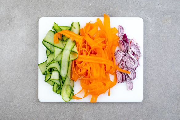 Inzwischen die Karotte schälen und mit einem Sparschäler in dünne Streifen schneiden. Die Gurke ebenfalls mit dem Sparschäler in dünne Streifen schneiden, das Kerngehäuse aussparen. Die Zwiebel schälen, halbieren und in feine Streifen schneiden.