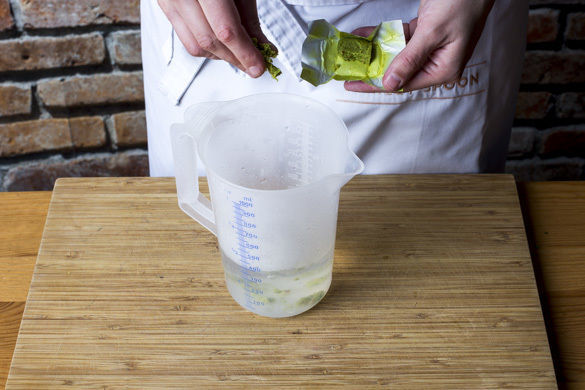 Den Brühwürfel in einem Messbecher in 1,2L heißem Wasser auflösen. Die Safranfäden in einem Mörser mit 1 Prise Zucker oder Salz fein zerstoßen und anschließend in ca. 2TL heißem Wasser auflösen.